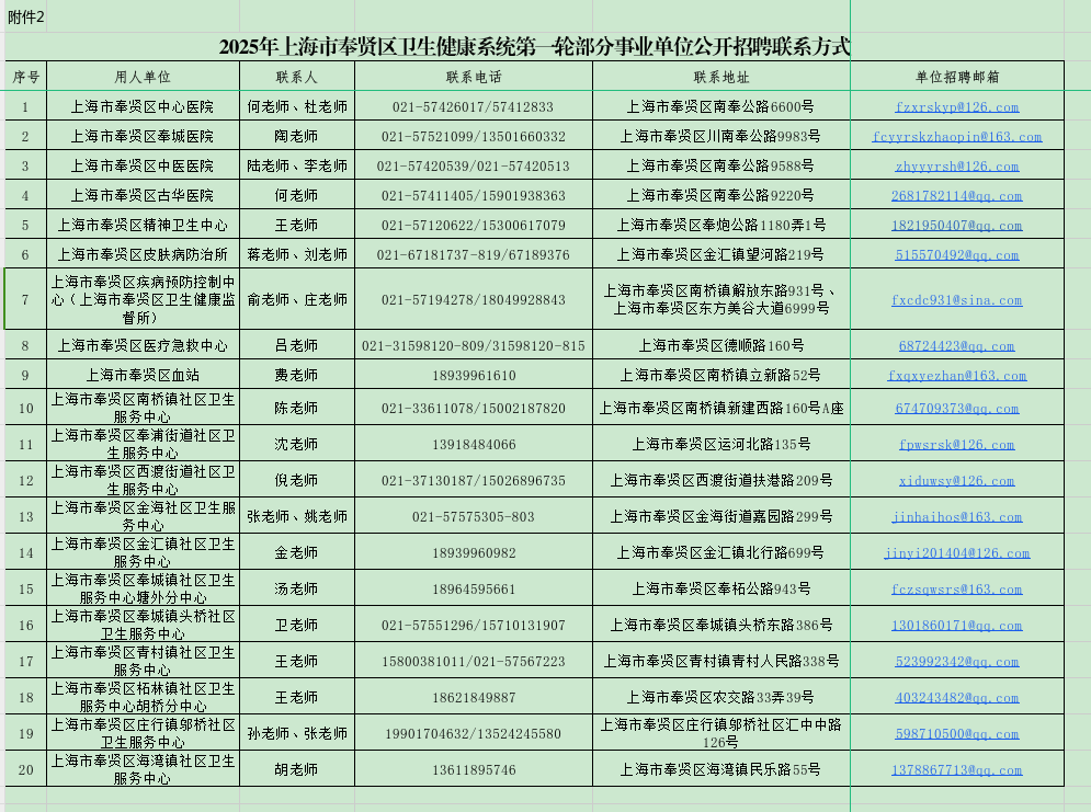 2. 报名方式:此次招聘通过各招聘单位电子邮箱投递的方式报名,详见《2025年上海市奉贤区卫生健康系统第一轮部分事业单位公开招聘联系方式》(附件2)。
