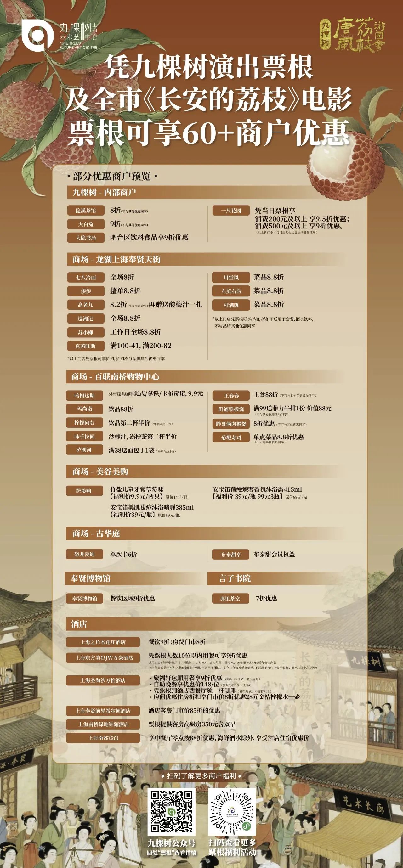 凡购买话剧《长安十二时辰》任意日期任意票档的观众,即日起可凭借演出纸质票,于7月26日19:30前,前往九棵树票务中心,兑换7月26日19:30《长安的荔枝》电影票*1张,一票一张。