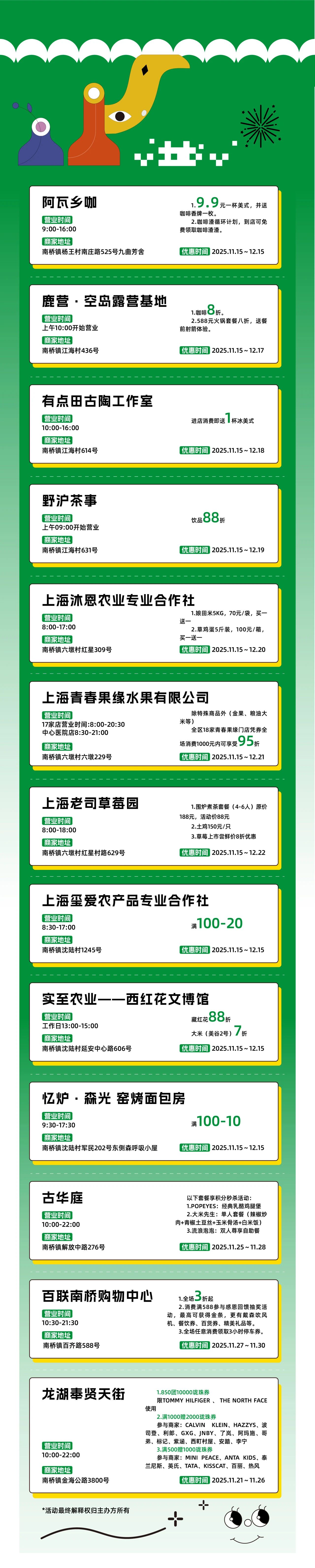 11月15日至12月22日,由南桥镇文体中心牵头,江海村、沈陆村、六墩村、杨王村辖区内的多家优质商家以及百联南桥中心、古华庭、龙湖奉贤天街3大商圈商户,联合开启“摩登消消乐”活动,为摩登田野2025新海派乡村艺术节注入更丰富的活动体验。