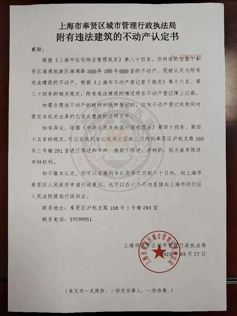 戴敏: 我局于2023年02月14日依法对你涉嫌违法搭建建(构)筑物一案进行立案调查,现已认定你所有的坐落于奉贤区海湾旅游区海湾路3**弄1**号***室的不动产附有违法建筑,因无法用其他方式向你送达相关文书,依照《中华人民共和国民事诉讼法》第九十五条的规定,向你公告送达“附有违法建筑的不动产认定书”。
