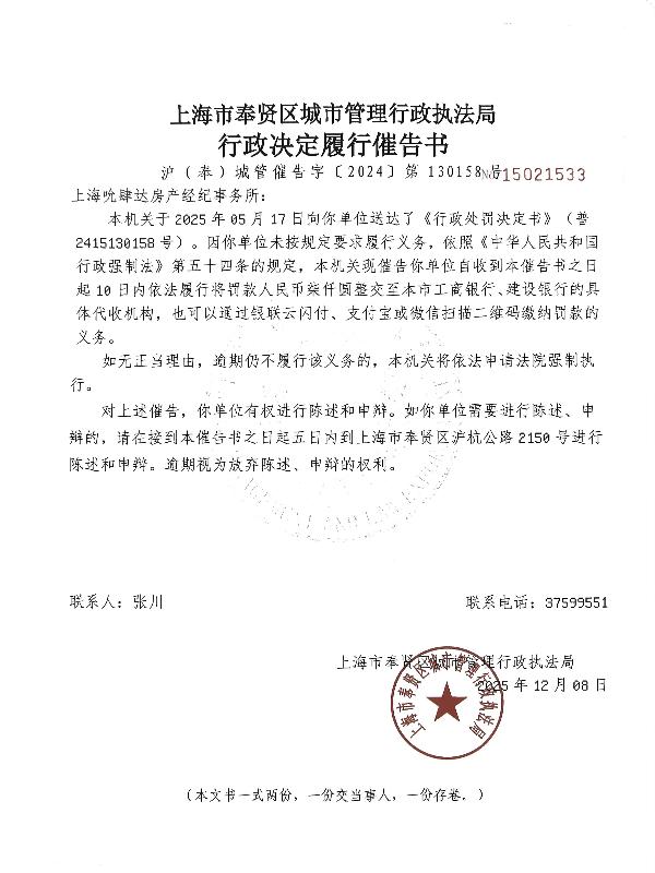 上海吮肆达房产经纪事务所——《行政决定履行催告书》公告