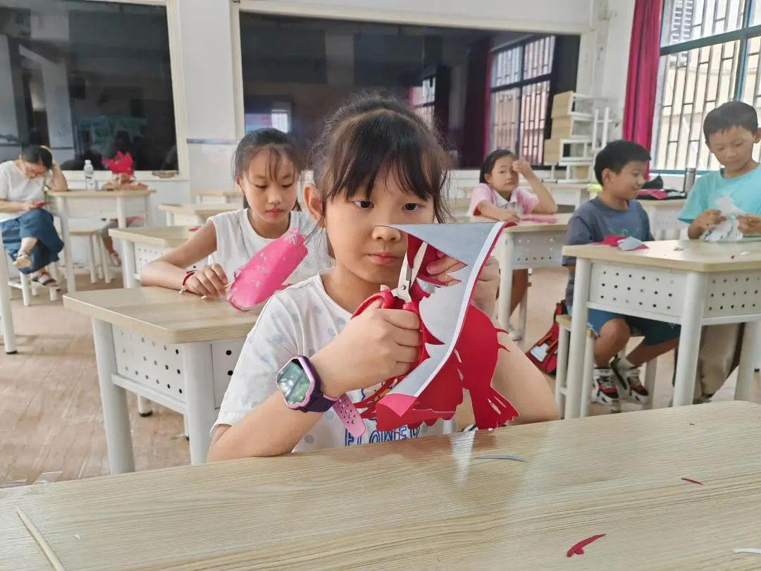 据了解,此次课程邀请非遗传承人钱肖红结合建军主题、农产主题、环境主题,创作出画面简单又充满童趣的剪纸图样,带领学生走进丰富多彩的非遗世界。之前的三次课程已在不同的学校开展,分别以“星星闪耀”“桃子来了”“呼唤海豚”为主题,激发了学生动手制作的兴趣和学习的热情。