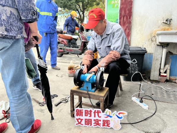 秦塘居委开展磨剪刀、理发等便民服务。志愿者细心地打磨居民们的刀具、剪刀,居民提供家门口就能够享受到的理发贴心服务。
