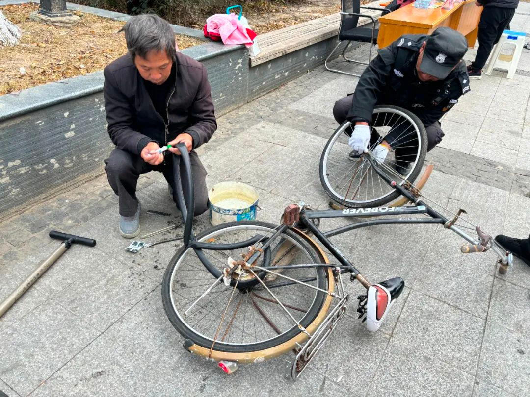 君望居委现场为居民提供修车、磨剪刀、剪头发、血压测量等多项便民服务。
