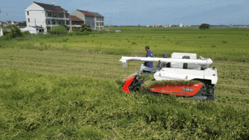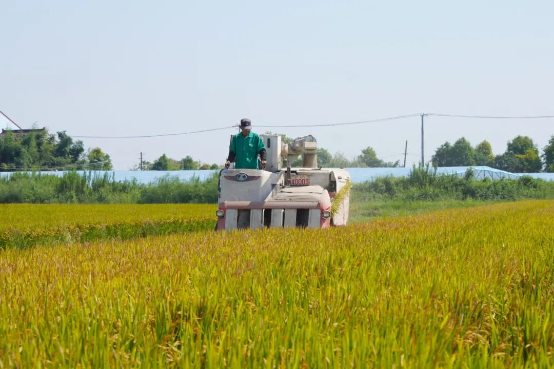 稻田里,金黄的稻谷颗粒饱满,沉甸甸的稻穗压弯了腰,农机手熟练地操作着收割机来回穿梭,随着一排排水稻收入转动的拨禾轮,秸秆碎屑从后方出杂口处飘出,金黄的稻谷就被“尽收囊中”。