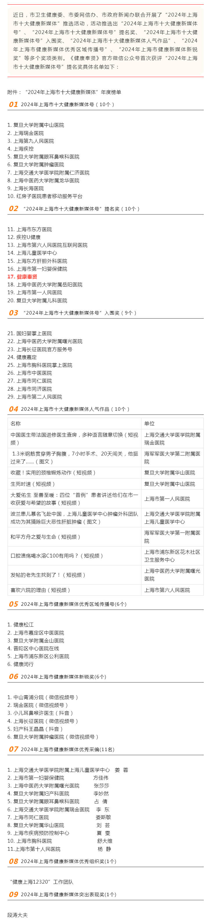 结果揭晓!“健康奉贤”获评“上海市十大健康新媒体号”提名奖