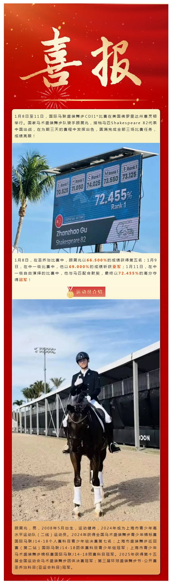 年轻骑手顾展兆代表中国出战国际马联盛装舞步比赛夺冠