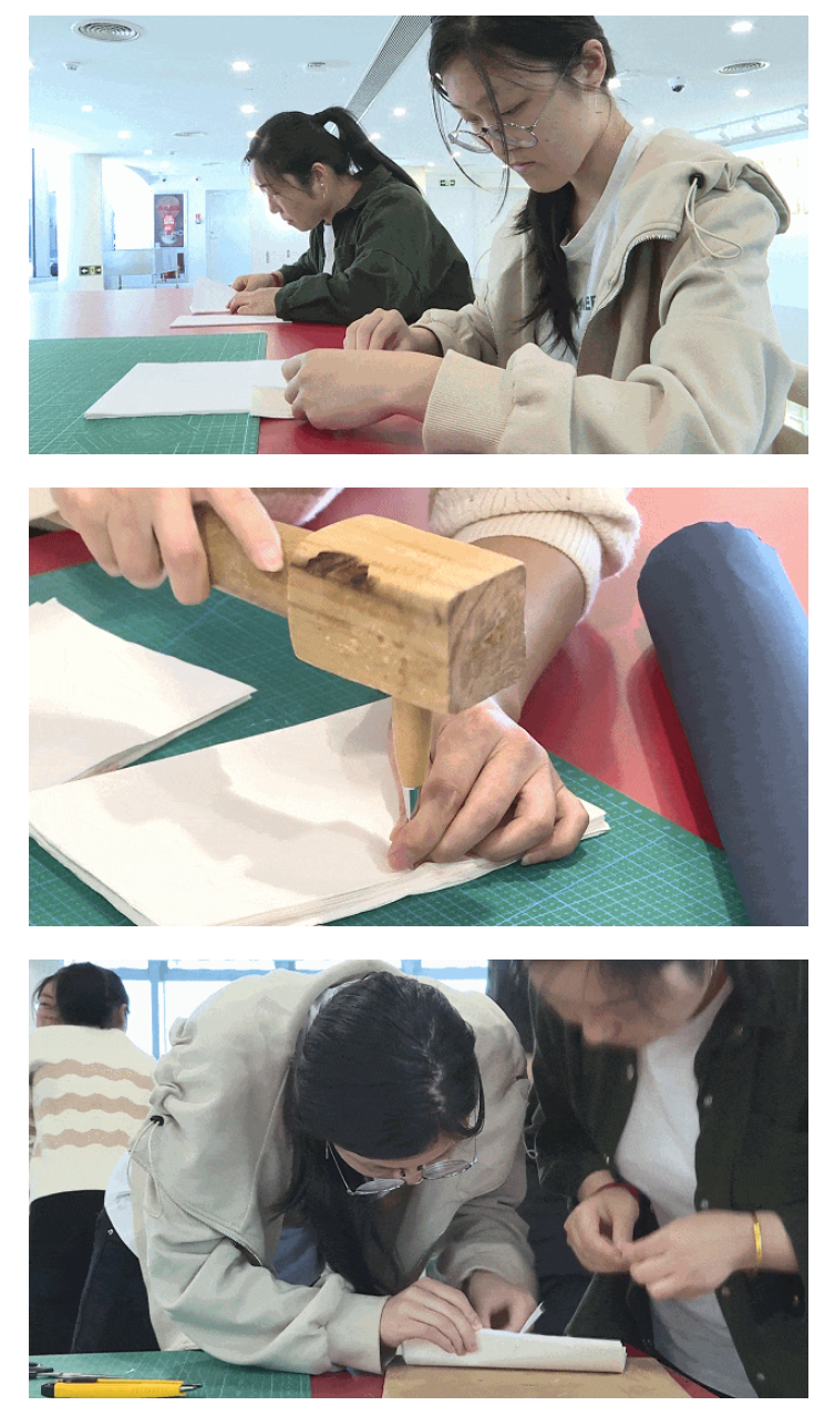 齐栏、裁剪、打眼、穿纸钉、上皮、订线……一本线装书的制作需经十余道传统工序。大家围在老师身边,聚精会神地琢磨着每一步是怎样完成的,从纸张的裁剪、纸捻钉的制作到如何用线装订,每一步都暗藏玄机。“原来穿针打孔的位置很有讲究,要先分成十等份,而且间距都有特定的比例。”“纸张得人工一张张去对齐,真的觉得很不容易,需要高度的专注力。”
