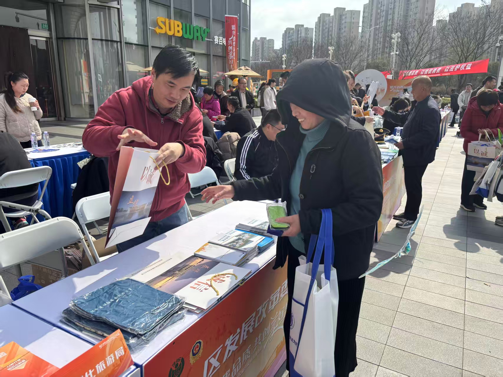 活动现场,区发展改革委工作人员在人流密集的核心商圈布设宣传点位,悬挂主题横幅,分发宣传手册,聚焦群众关切的消费领域信用热点、难点问题,热情接待每一位咨询群众。
