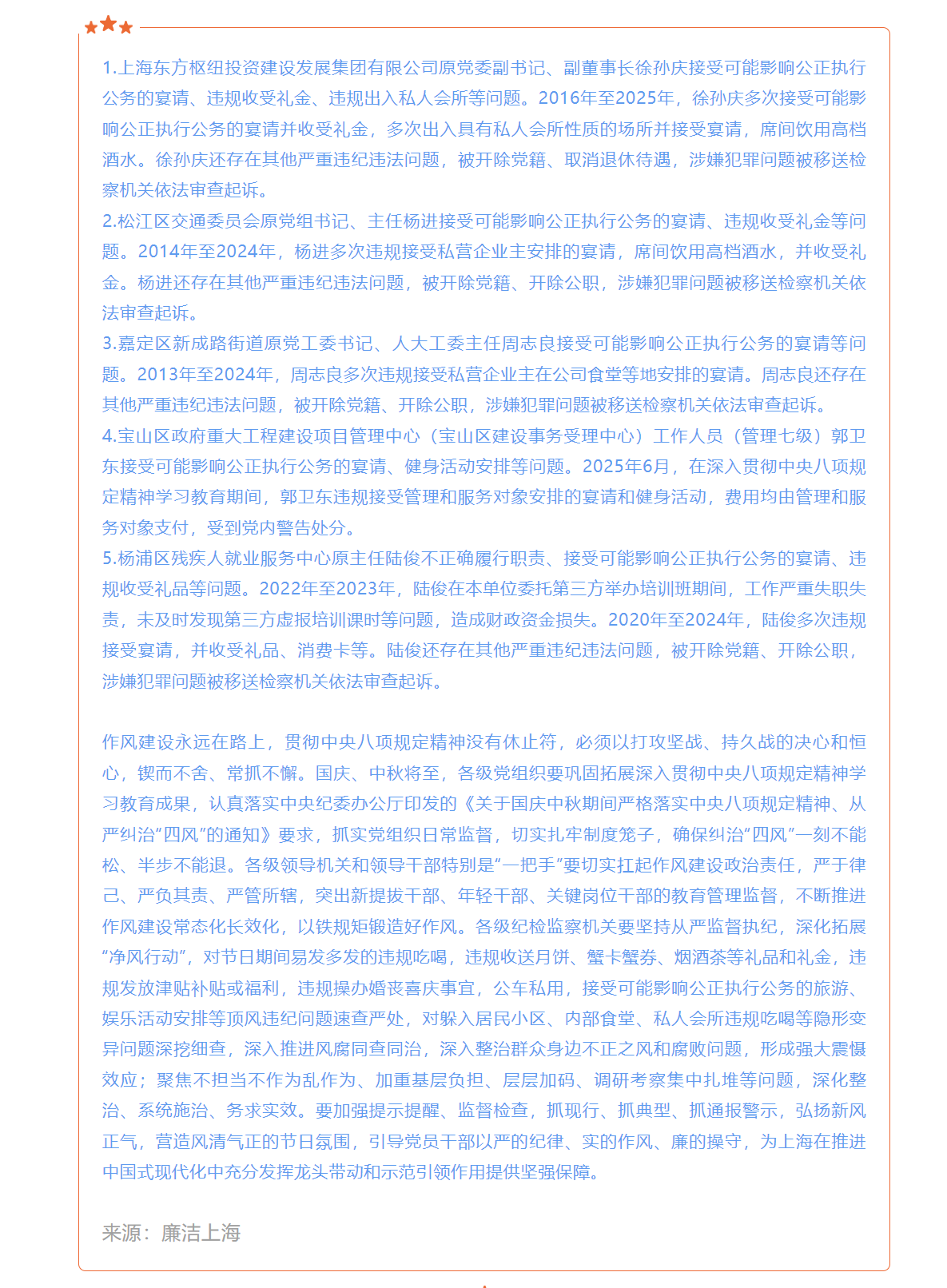 上海市纪委监委公开通报五起违反中央八项规定精神典型问题