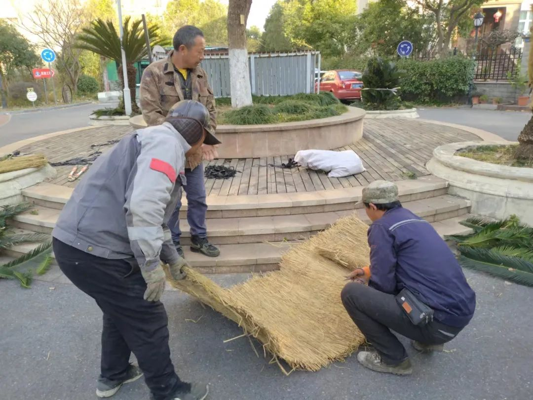 急速降温,树木也需要防寒保暖。工作人员对树干进行缠绕捆扎,为它们“添衣”保暖,助其平稳过冬。
