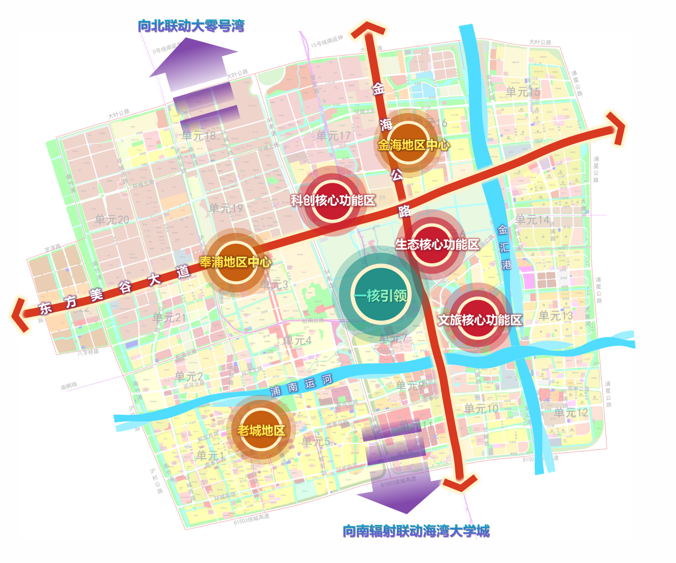 双轴联动。以金海公路以西-东方美谷大道“T”型主轴为纽带,打破板块边界、强化功能协同。打造东方美谷大道产业发展轴,规范沿街界面,优化产业布局与城市风貌,建成展示型、功能型标杆大道;依托金海公路交通联动轴,构建奉贤新城与大零号湾科创策源功能区、中心城区的快速联通廊道。聚焦美创产业创新引擎培育,打造生态宜居人文地标与全维功能聚合客厅,形成以“新”破局的新城核心板块体系。