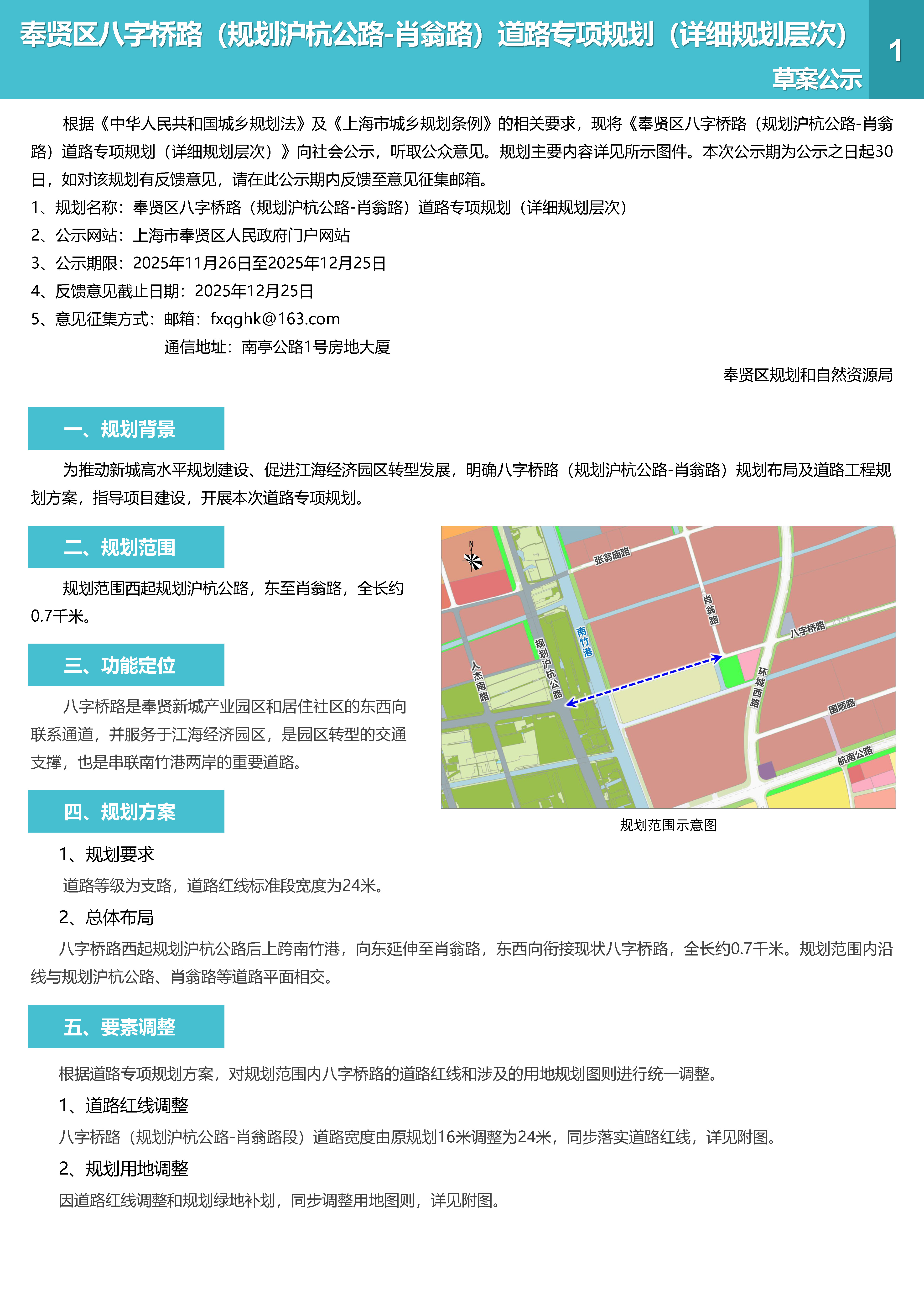 奉贤区八字桥路(规划沪杭公路-肖翁路)道路专项规划(详细规划层次) 草案公示