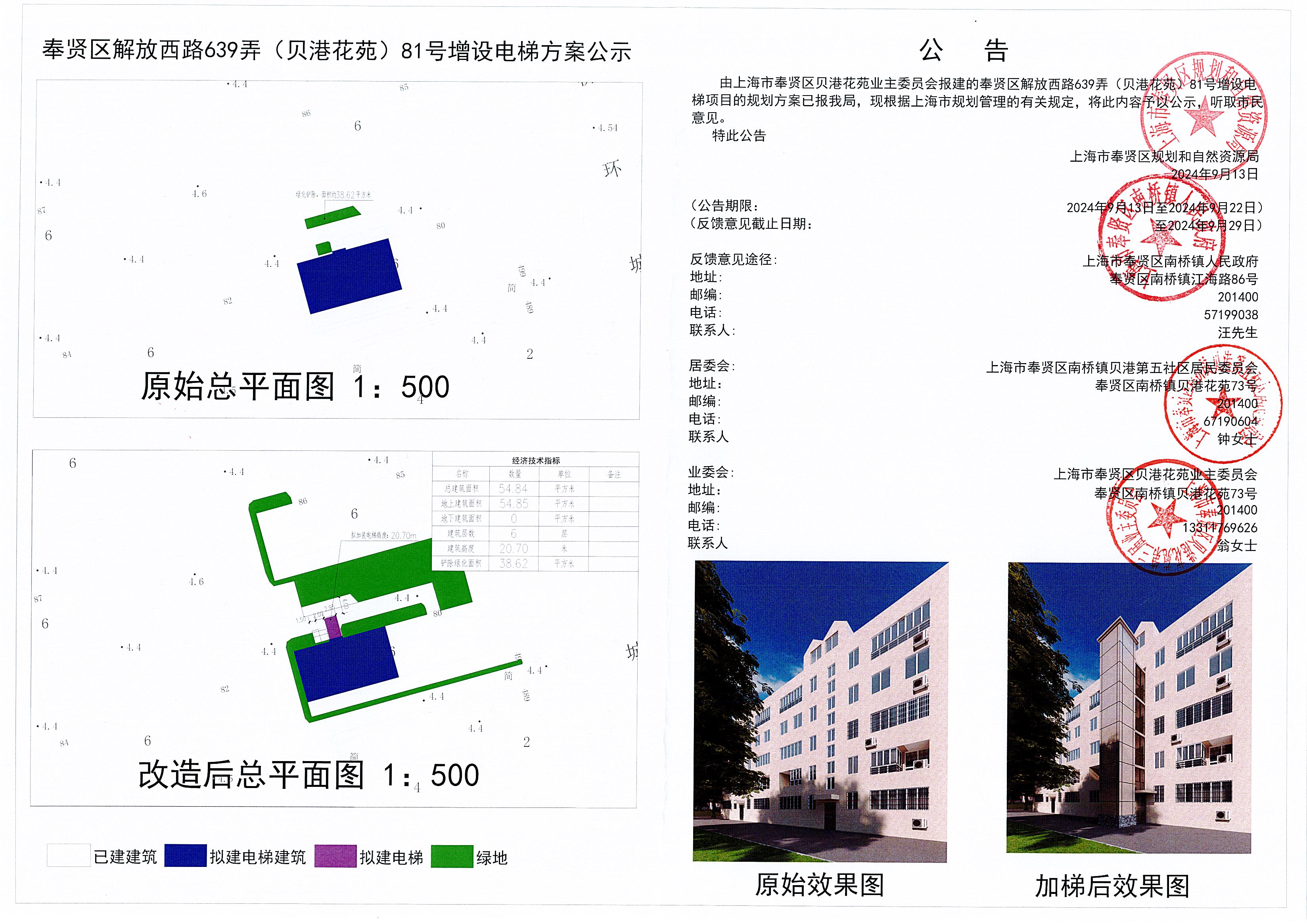 上海市奉贤区解放西路639弄(贝港花苑)81号增设电梯方案公示