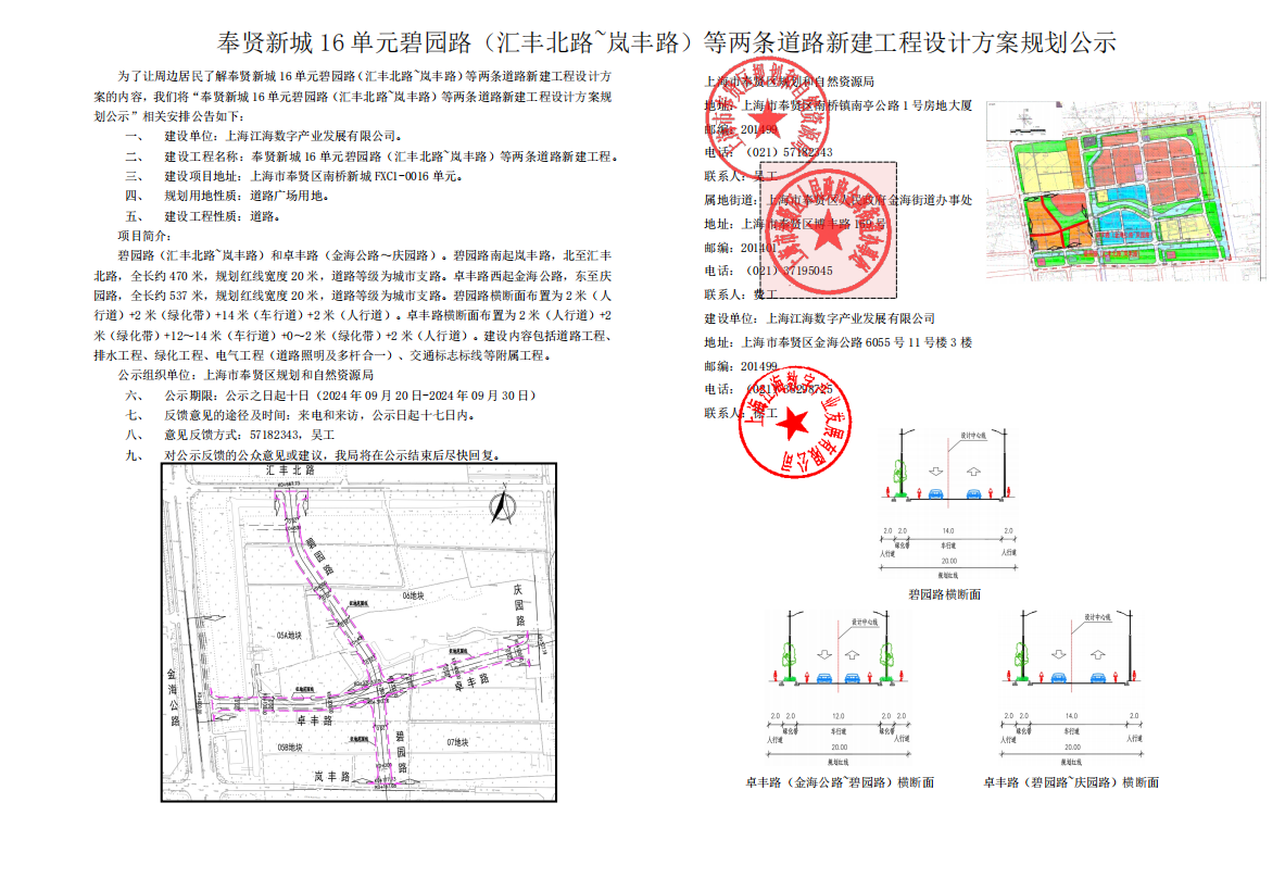 奉贤新城 16 单元碧园路(汇丰北路~岚丰路)等两条道路新建工程设计方案规划公示