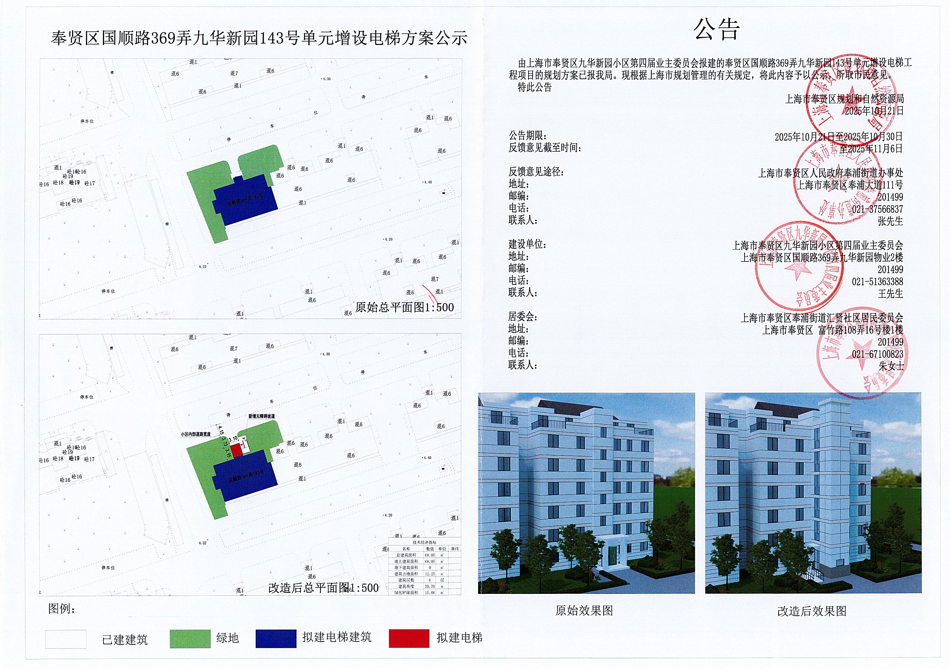 奉贤区国顺路369弄九华新园143号单元增设电梯方案公示