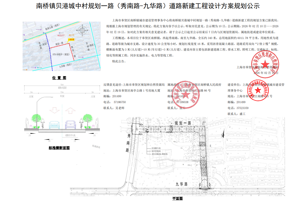 南桥镇贝港城中村规划一路(秀南路-九华路)道路新建工程设计方案规划公示