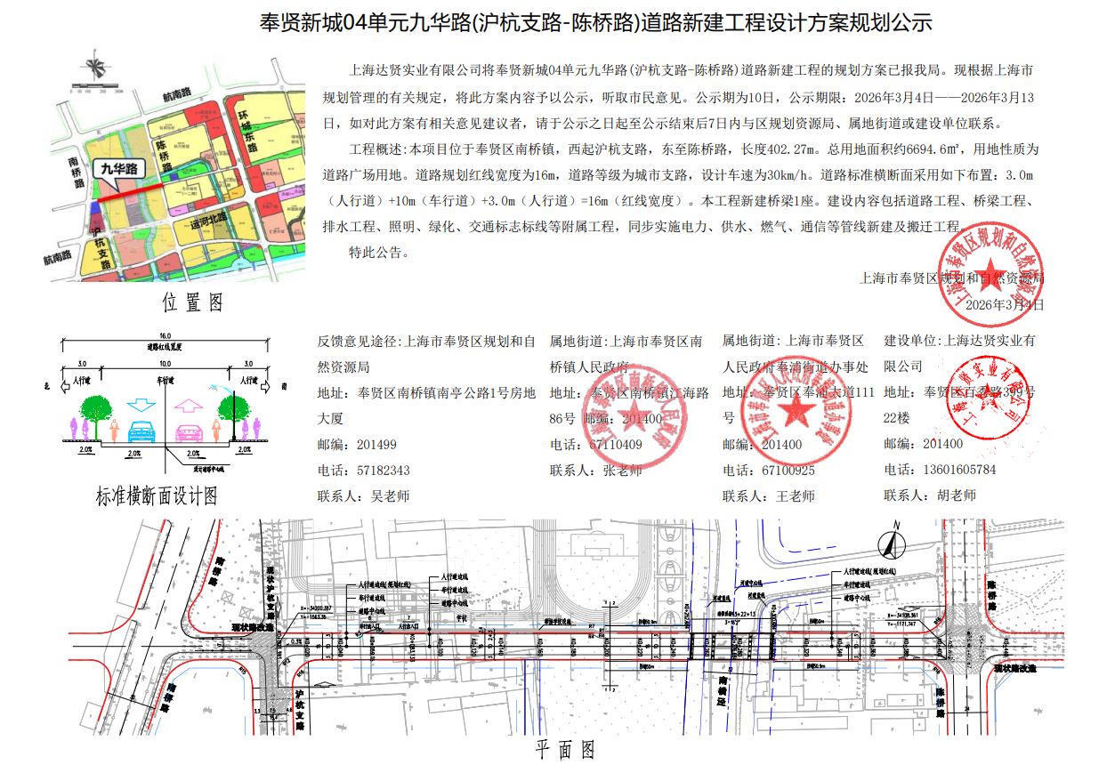 奉贤新城04单元九华路(沪杭支路-陈桥路)道路新建工程设计方案规划公示