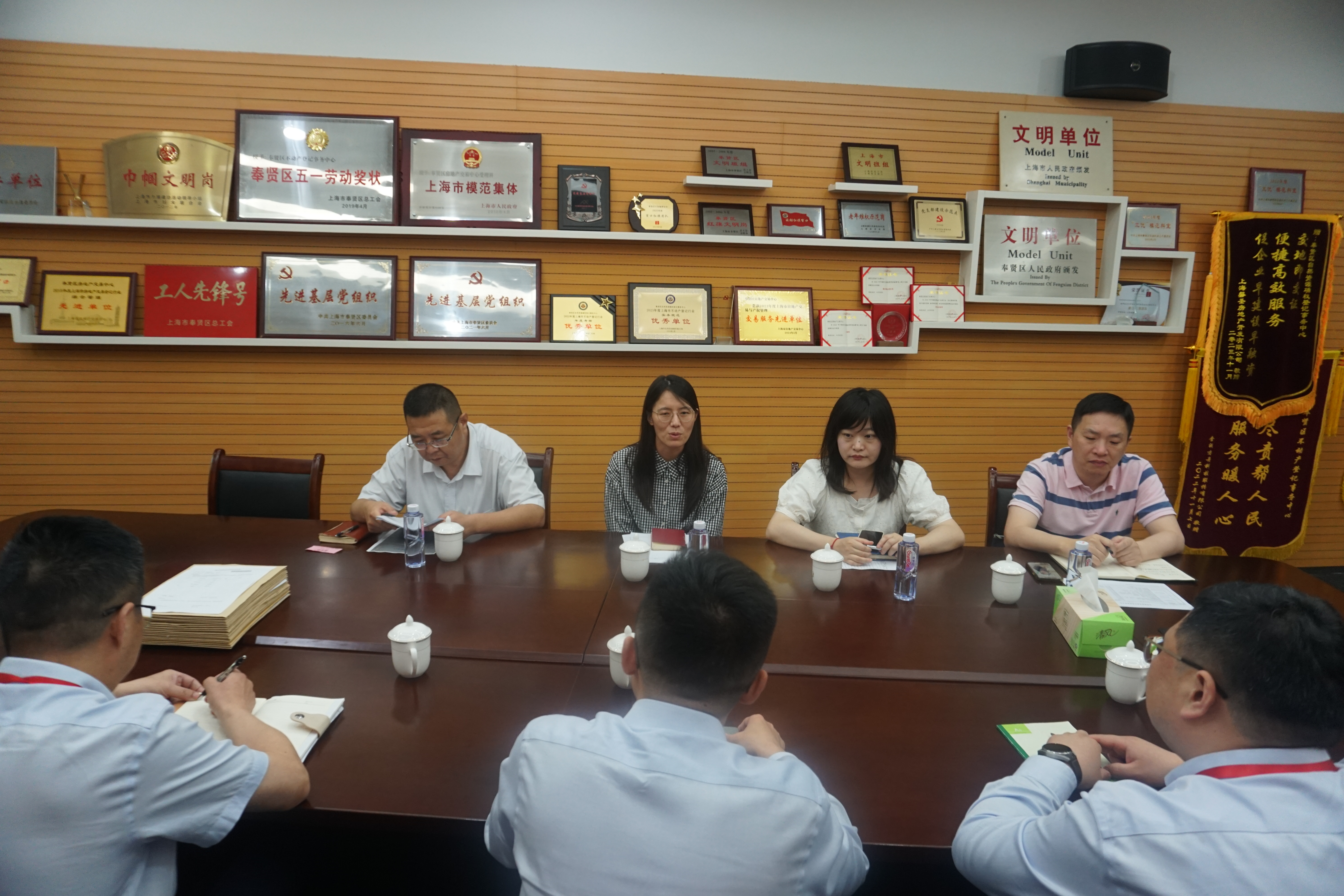 发布时间:2024-07-22近日,上海市自然资源确权登记事务中心赴奉贤区自然资源确权登记事务中心开展走访调研。市考核组实地考察了办事大厅,详细了解窗口设置、业务办理流程等情况,并表示慰问。区自然资源确权登记事务中心主任陆志刚围绕本区新建商品房认购查询、存量房交易情况、队伍建设、窗口管理、交易业务和党建工作作详细汇报。