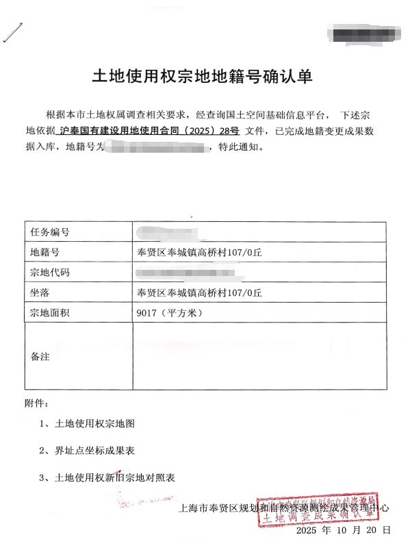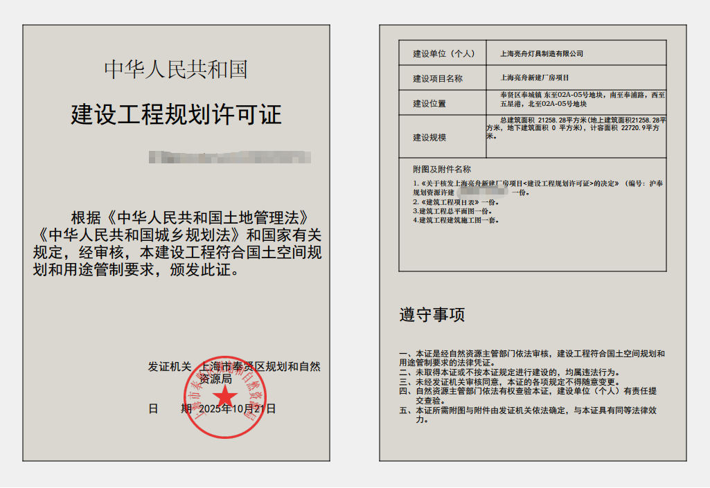 2025年10月15日下午,上海亮舟灯具制造有限公司成功摘得奉贤区奉城工业园区FXS2-0103单元02A-06号地块,并签订土地出让合同。在区规划资源局、区建管委、区发改委等职能部门和属地奉城镇的通力合作下,仅五个工作日便取得《地籍变更确认单》《企业投资项目备案证明》《不动产权证书》《建设用地规划许可证》《建设工程规划许可证》《建设工程施工许可证》,实现“六证齐发”。