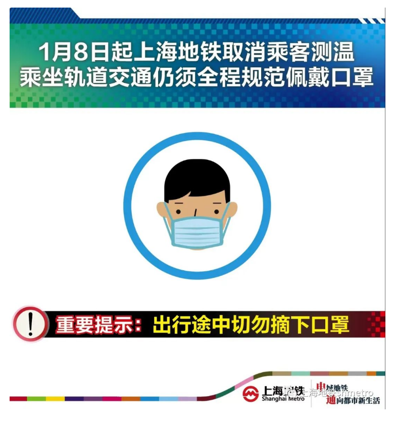 申通地铁集团提示,根据最新疫情防控要求,自2023年1月8日运营开始起,上海轨道交通所有车站不再对进站乘客进行体温测量。乘坐地铁请全程佩戴口罩,同时做好手卫生、保持人际距离、注意咳嗽礼仪。出现发热等症状人员或阳性人员避免乘坐轨道交通。