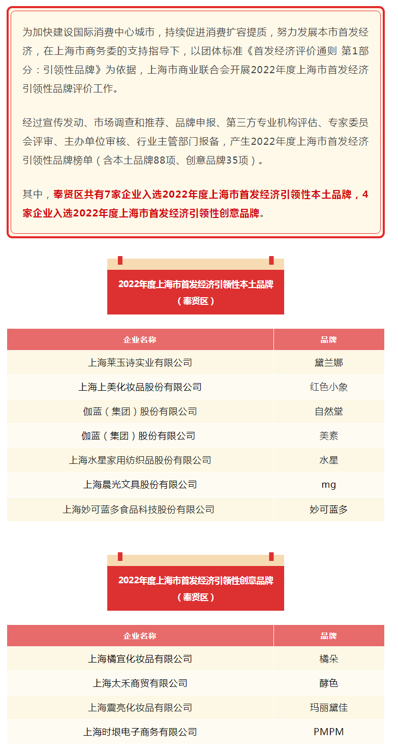 奉贤11家企业入选2022年度上海市首发经济引领性品牌榜单