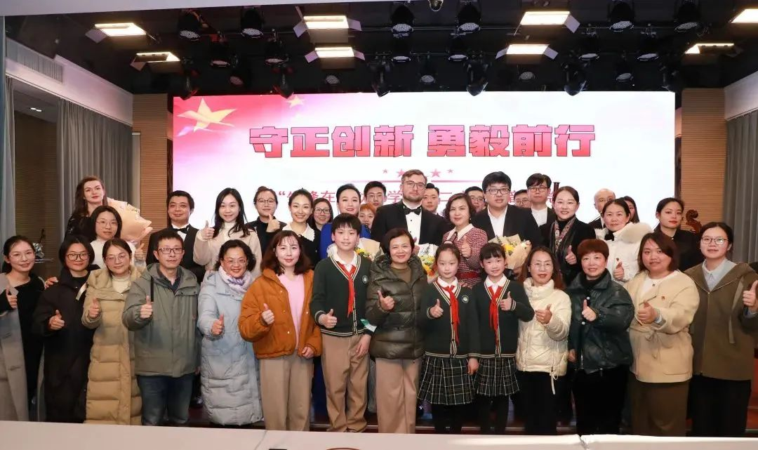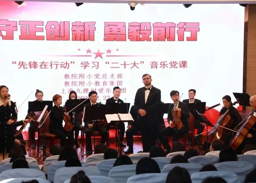 交响乐融合男女高音演唱、理论宣讲、诗画展示……2月27日下午,在奉教院附小陈桥路校区多功能厅,上演了一场新颖的音乐党课。上海九棵树爱乐乐团走进校园,颂奏结合,将党的历史和理论融汇其中,让师生在音乐中重温党史,在旋律中感受初心。
