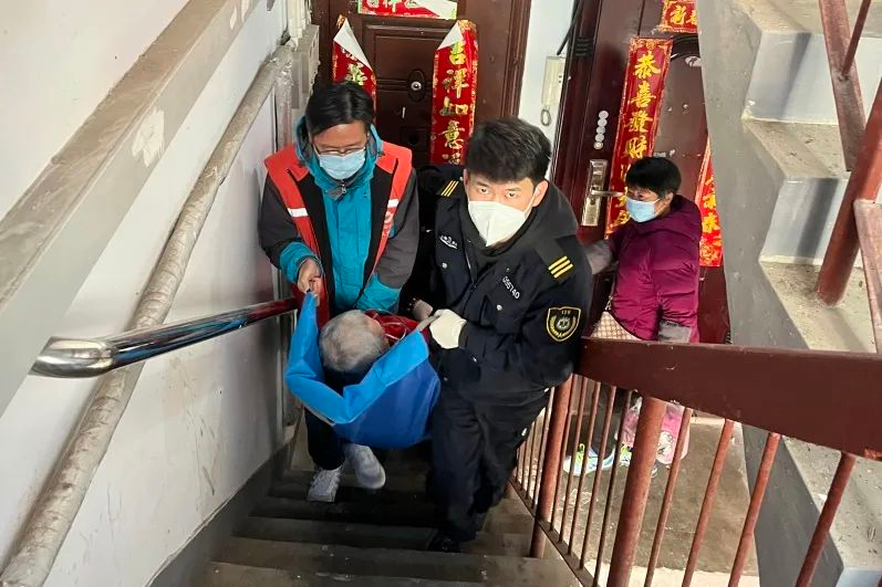 家住新二村的陈老伯患有哮喘、高血压等多种疾病,出门不便,平时上下楼,居委会工作人员都会搭把手。当天陈老伯出院回家,居委会工作人员收到消息后,提前在楼梯口等待,协助急救人员把陈老伯抬上楼。
