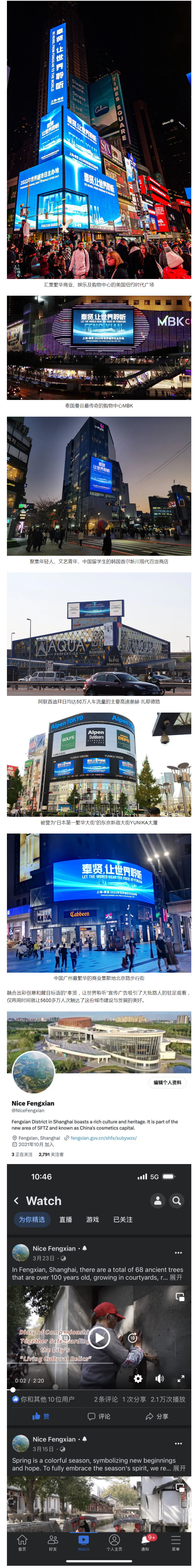 立足“新片区西部门户、南上海城市中心、长三角活力新城”定位,抓住自贸区新片区建设、“五个新城”建设、长三角一体化发展等重大战略机遇,新年伊始,奉贤区委宣传部、区新闻办就开始布局国际传播,“借船出海”,向世界发出奉贤强音。除了大屏的惊艳出击,奉贤区还和新华社新闻信息中心上海中心合作,开通了“Nice Fengxian”海外社交媒体双平台,聚焦奉贤的经济发展、城市建设、传统文化及自然风景等特色亮点内容,从浓浓书香味的江南书局到人声鼎沸的奉贤天街,从诗意满满的海湾国家森林到江南古典园林古华公园,以图文、视频等形式来讲述奉贤的故事,多条帖文内容吸引了上千网友的关注。