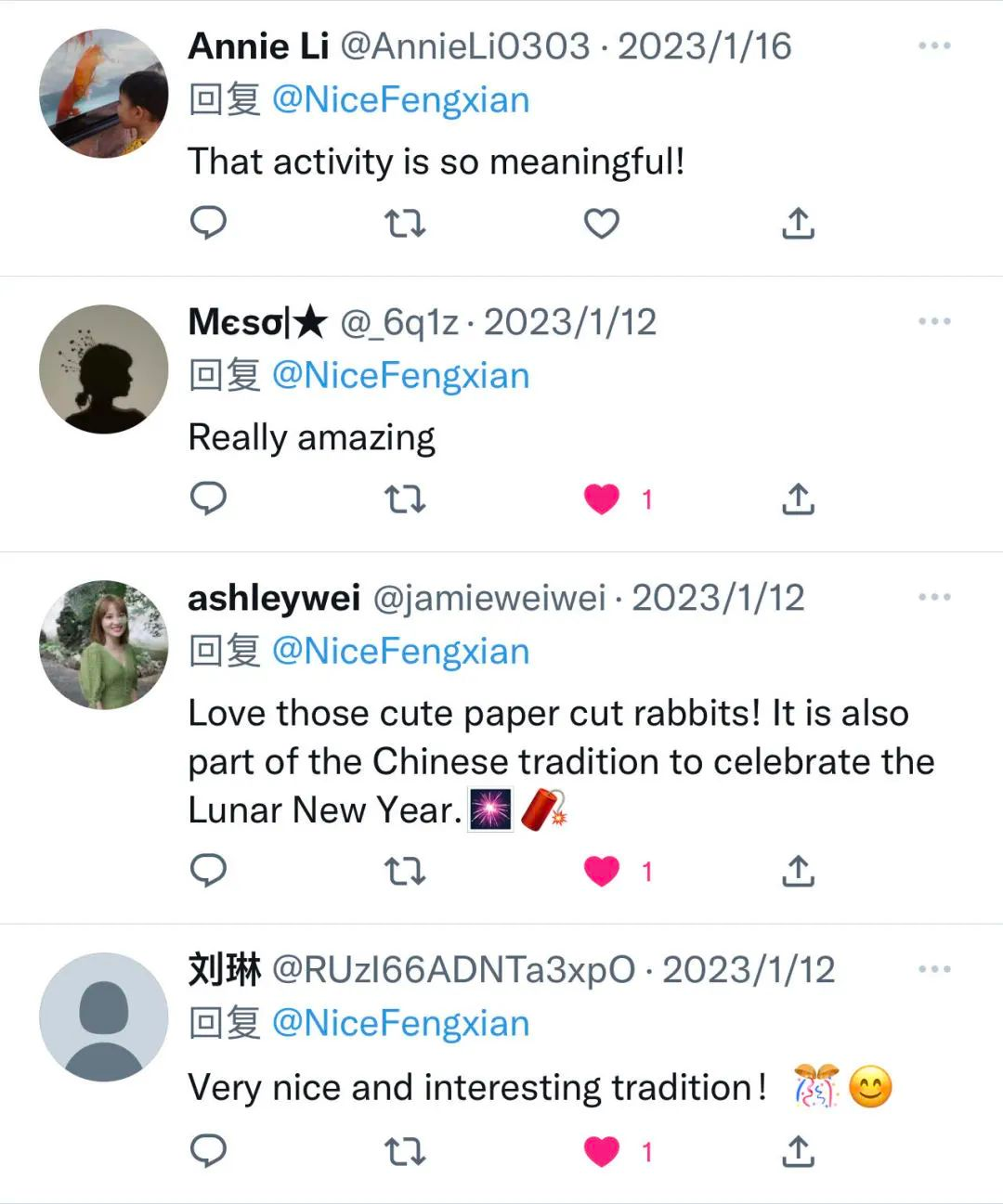 3月发布上海之鱼公园群的视频,仅推特一个平台的浏览量就达到了67.3万;新年期间,发布了奉贤区的剪纸文化活动,引起了海外网友的高度好奇和关注,截至4月6日该贴文在推特上获得了1285人点赞,脸书上1339人点赞。奉贤新年的第一缕阳光在推特的浏览量达105万,上海日报海外推特账号主动转发并点评该条推文。同时,奉贤区还借央媒平台优势,与国内超过十个城市的海外账号进行互联互通,有效提升了“Nice Fengxian”账号在海外网络的曝光量及影响力。