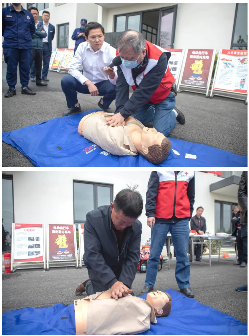 演练中,消防救援队员通过使用烟雾弹、油桶模拟出火灾现场,演示了如何快速有效逃生、如何正确使用灭火器、消防水带扑灭火种等,并指导村民们参与火灾扑救演练,让防灾减灾知识“看得见,摸得着”。同时,镇红十字会也为村民们详细讲解了心肺复苏操作流程。