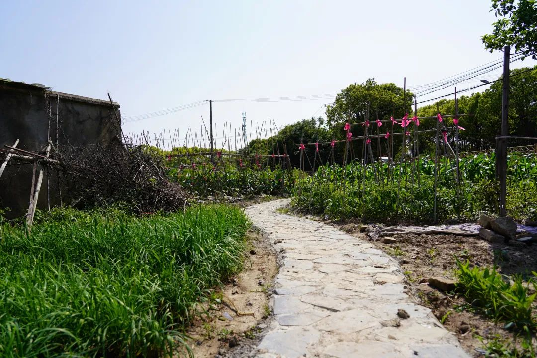 让我们走进菜园一探究竟,一条长长的青砖路两边,种着村民们的蚕豆、生菜、韭菜、米苋、玉米、茄子、黄瓜……各类蔬果全都长得郁郁葱葱,品类繁多但秩序井然。