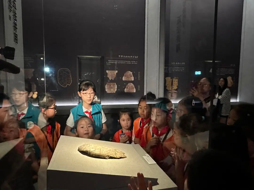 相比大人讲解,眼前这位“大姐姐”的讲解,除了专业以外,还更有亲和力,孩子们不仅能听懂丹甲青文中蕴含的深奥秘密,对身边这位大姐姐还敢于提问和互动,看似枯燥的汉字在孩子们心中逐渐产生好奇,更对这位“大姐姐”的“工作”产生了不少兴趣。奉贤区恒贤小学学生陆可欣说:“我感觉大姐姐讲解得很清楚,我都能懂,而且很羡慕他们,希望我下次也能参加这样的活动。”龙梦晗则很欣喜:“大姐姐叫我们仔细看看那些器具,我真的看到上面刻上了甲骨文,我感觉非常非常的有趣。”周睿跃对“姐姐讲解”充满敬佩:“我现在是二年级,她是五年级,就比我大三四岁,但是可以给大家作一些讲解,真的太了不起了。”