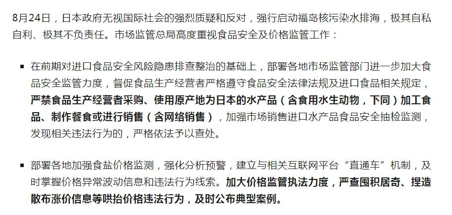 市场监管总局:加大水产品食品安全监管及食盐价格监管力度