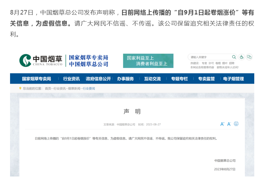 “自9月1日起卷烟涨价”?中国烟草回应