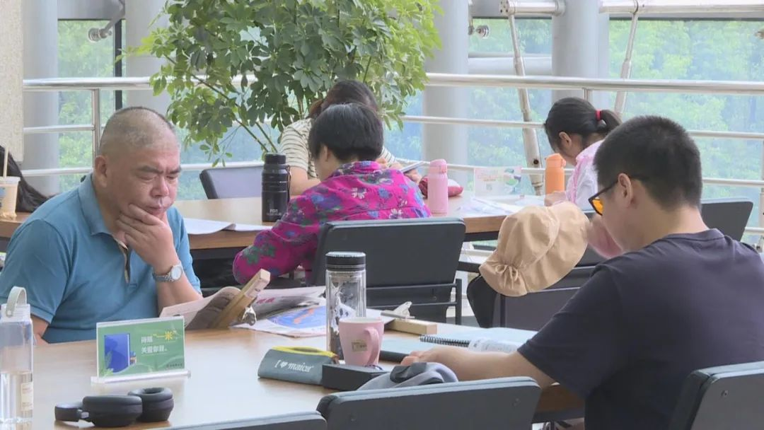 记者来到图书馆二楼看到,宽敞的走廊里,一排排阅读桌前坐满了或安静阅读或伏案学习或认真备考刷题的市民读者。即使到了暑期的末尾,但这里浓厚的学习氛围却一点也未改变。“在家里是一个人,写作业没有人来管你,在图书馆里的话就会有一种学习的氛围约束自己,好像在教室里一样。”正是因为如此,今年初三的陈怡欣告诉记者,她的暑期大部分时间都在这里度过。不过由于这里人气非常旺,大家通常会提前过来抢座位。