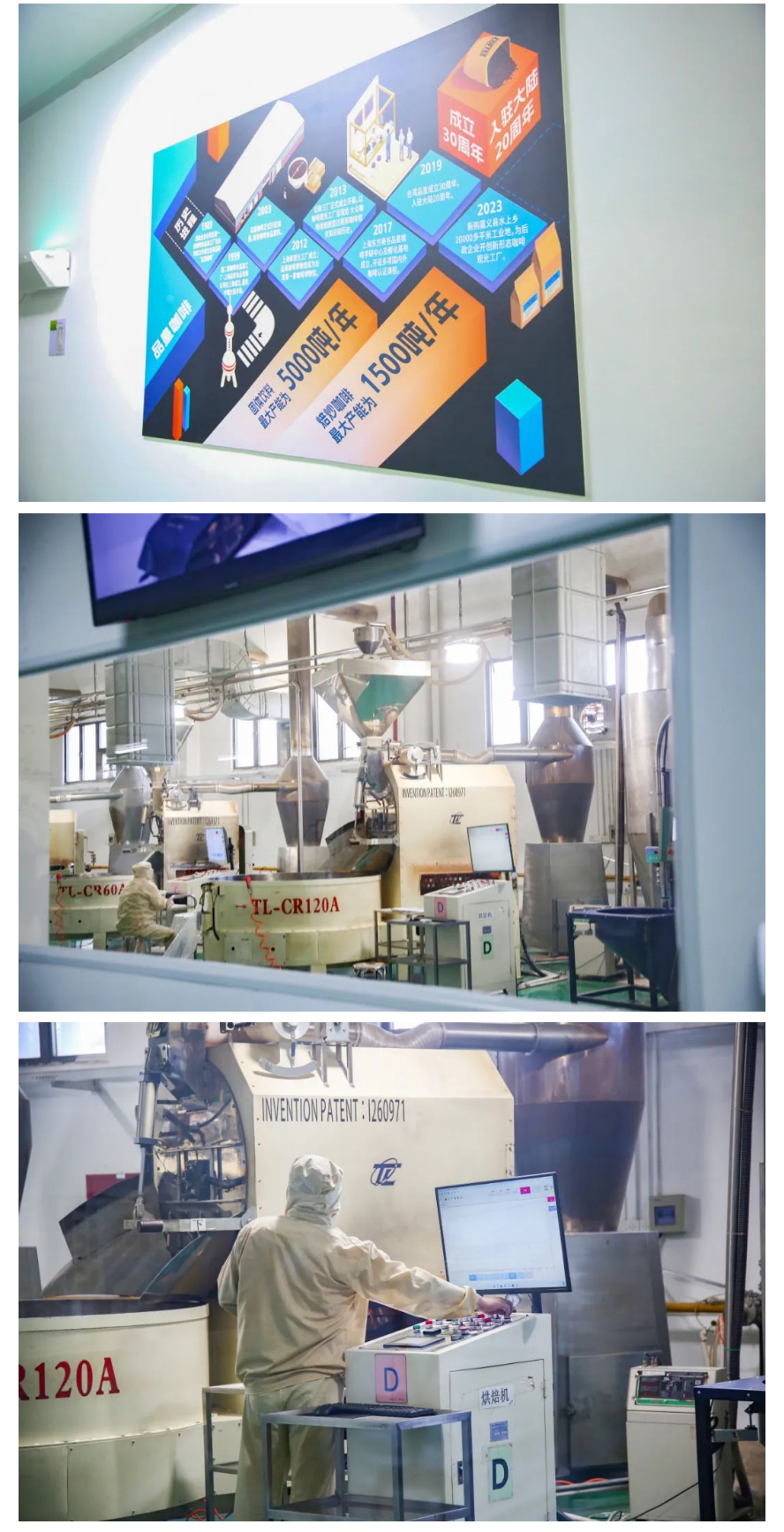 在工厂的观光通道,墙面上展示着“烘豆环境步骤”,隔着玻璃可以直接看到品皇咖啡生产的全过程。仓库里整整齐齐地摆放着一袋袋尚未烘烤的咖啡豆。另一边的生产车间,几名工人正在烘烤咖啡豆,据企业负责人介绍,工厂引入了来自意大利的全新机器,这台机器更加环保。看着工人工作的背影,可以用最直观的方式了解品皇咖啡是如何生产的,从咖啡豆的挑选,到烘焙过程中的把控,再到咖啡研磨与萃取的精细操作,最后再包装成袋。