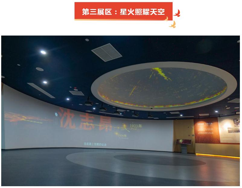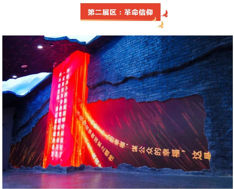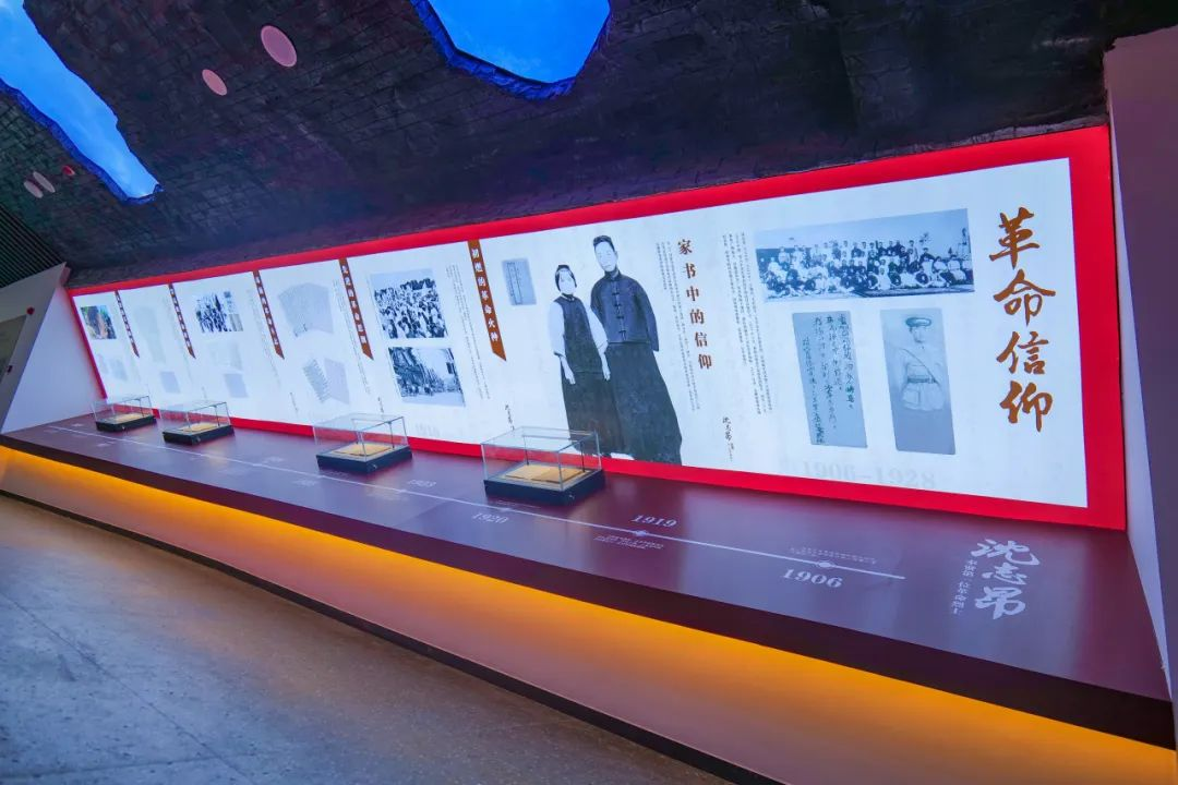 在革命信仰展区的信仰之柱上,展示着沈志昂家书中凝练的革命信仰。观众可站在互动点挥动手臂与信仰之柱互动,观看沈志昂的革命足迹与生平记事。
