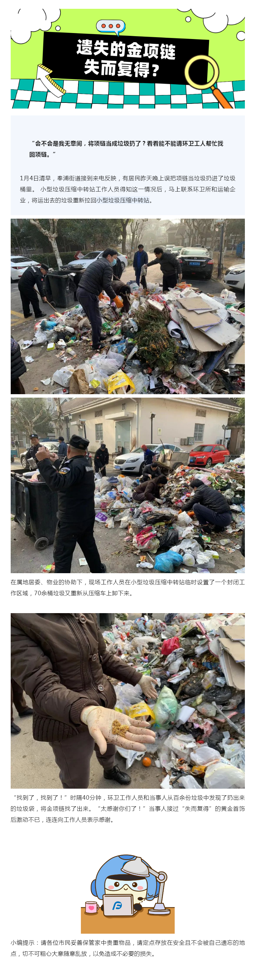 金项链误当垃圾扔?奉贤环卫工人在70余桶垃圾中帮忙寻找→