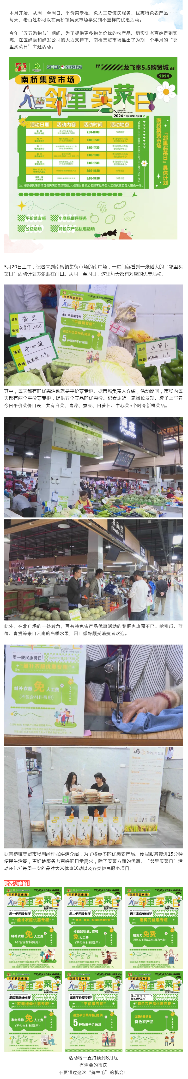 南桥集贸市场推出“邻里买菜日”,每日享受不重样优惠便民服务!