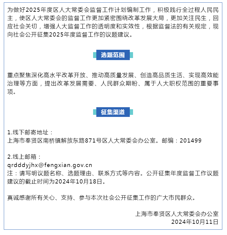 上海市奉贤区人大常委会征集2025年度监督工作议题建议的公告