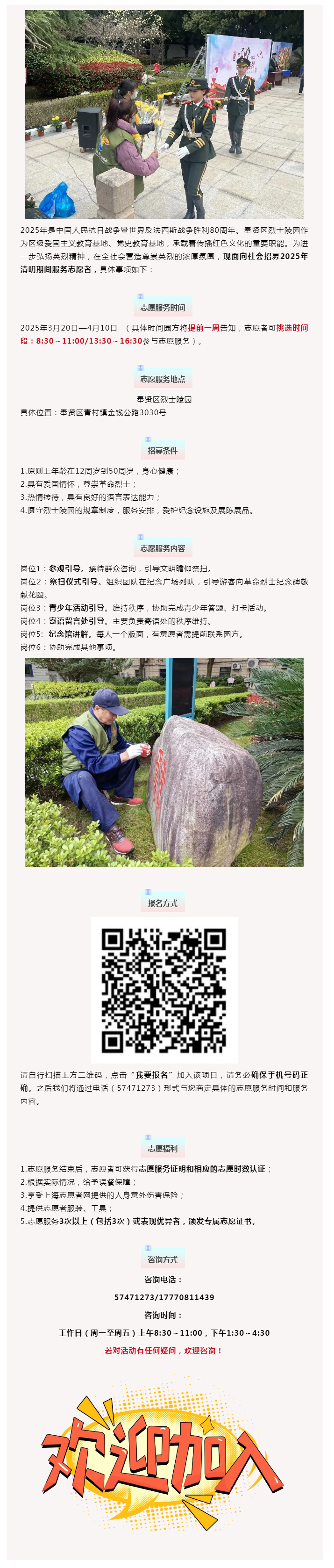 奉贤区烈士陵园2025年清明祭扫活动志愿者招募开始啦!