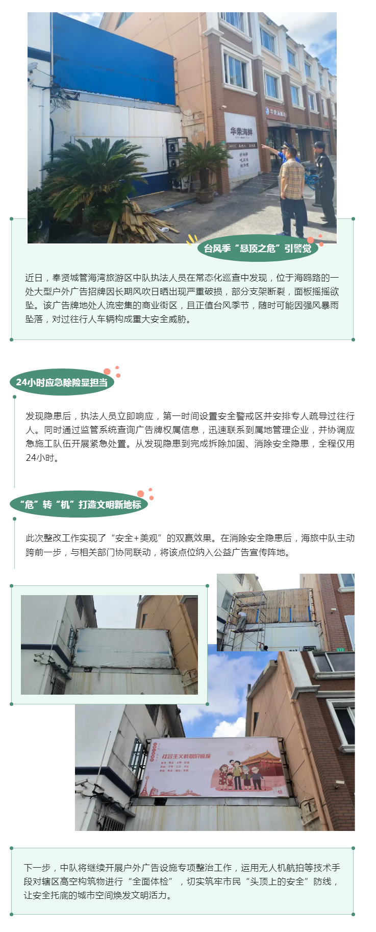24小时火速排险,破损广告牌“变身”城市文明风景线