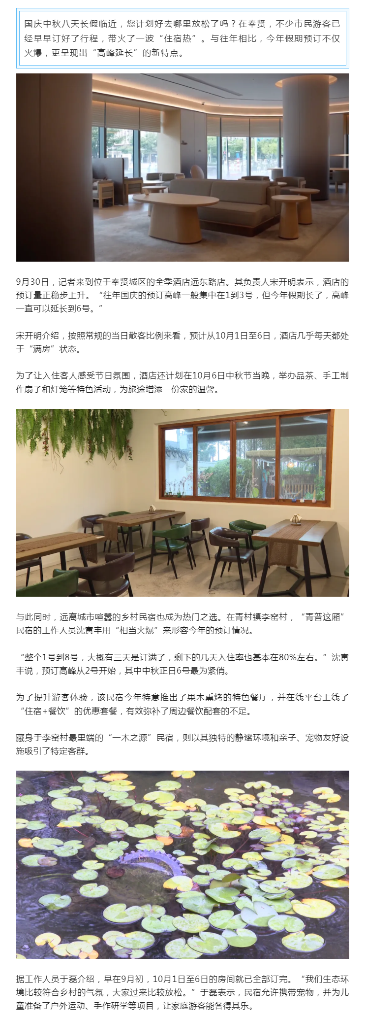 长假“双节”叠加,奉贤民宿酒店预订迎“加长版”热度