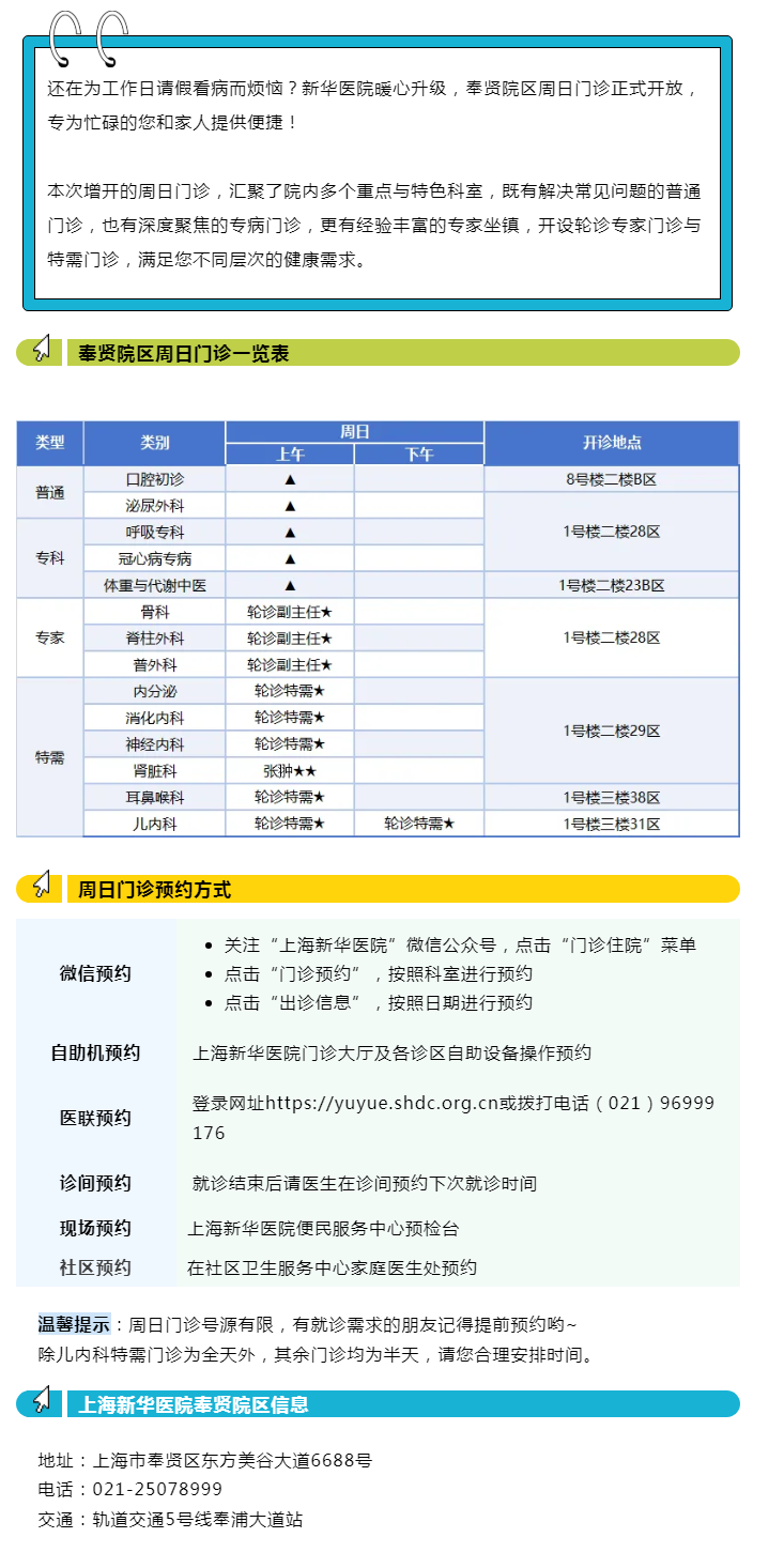 新华医院奉贤院区新增周日门诊,周末也能看专家了!