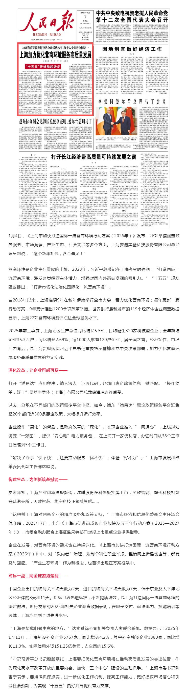 人民日报头版头条:上海加力优化营商环境服务高质量发展