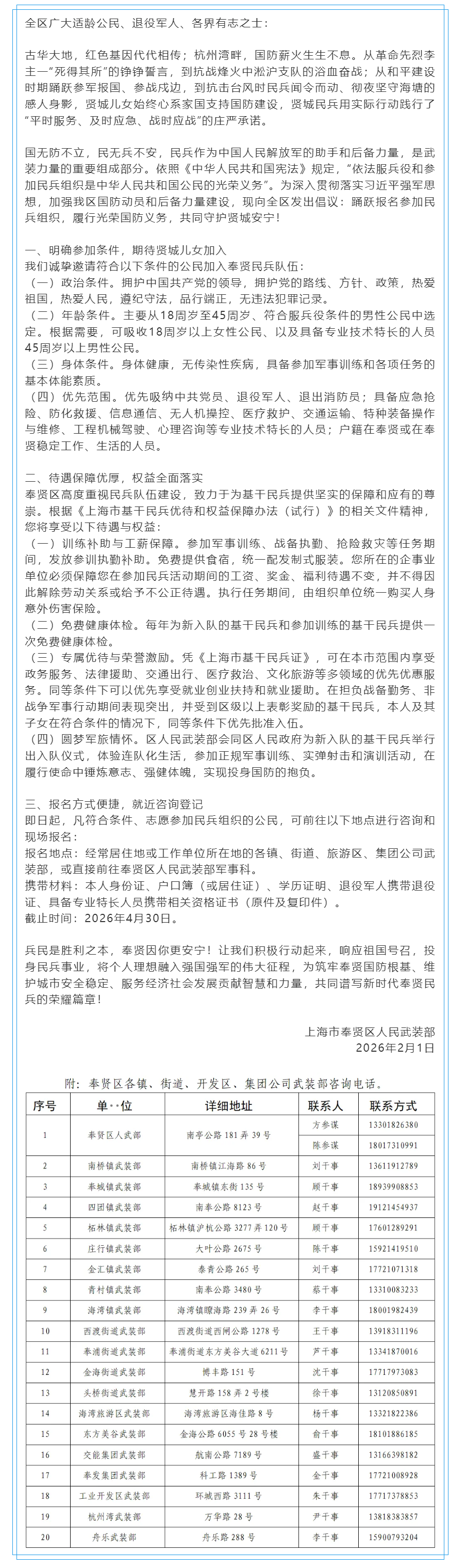 上海市奉贤区号召参加民兵组织倡议书
