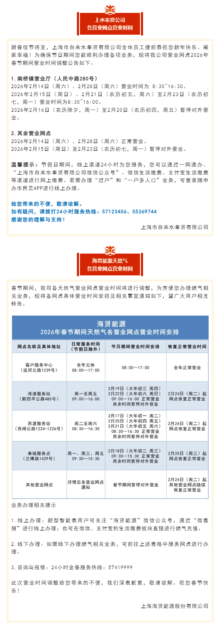 春节假期上水奉贤公司、海贤能源天然气各营业网点营业时间