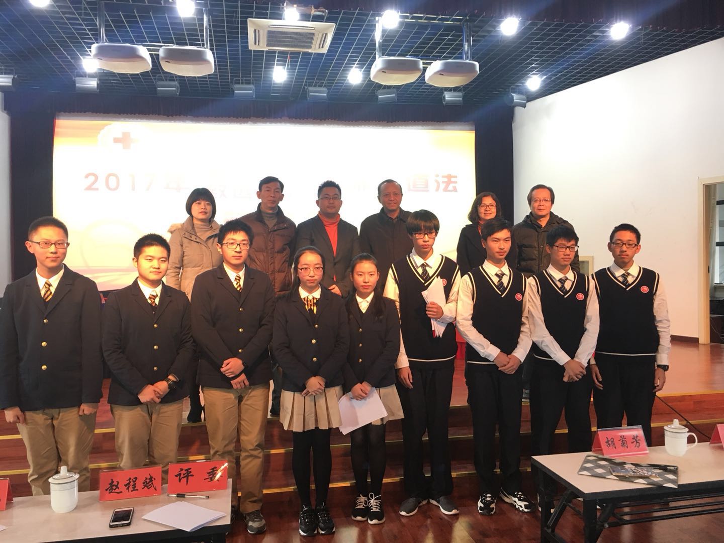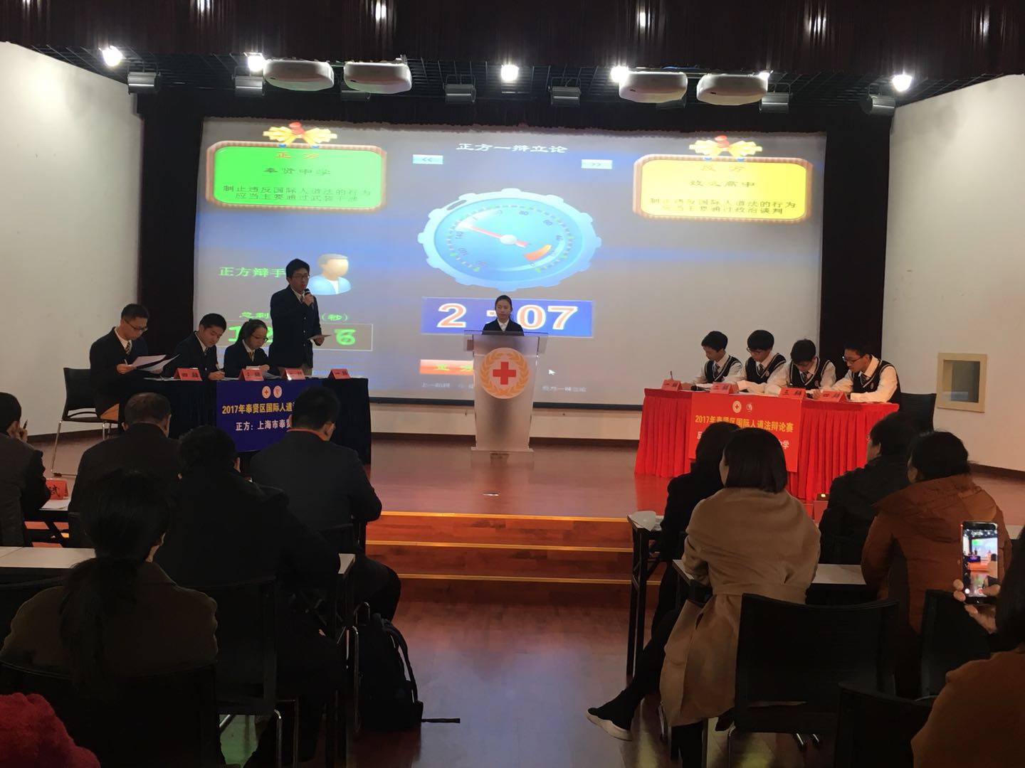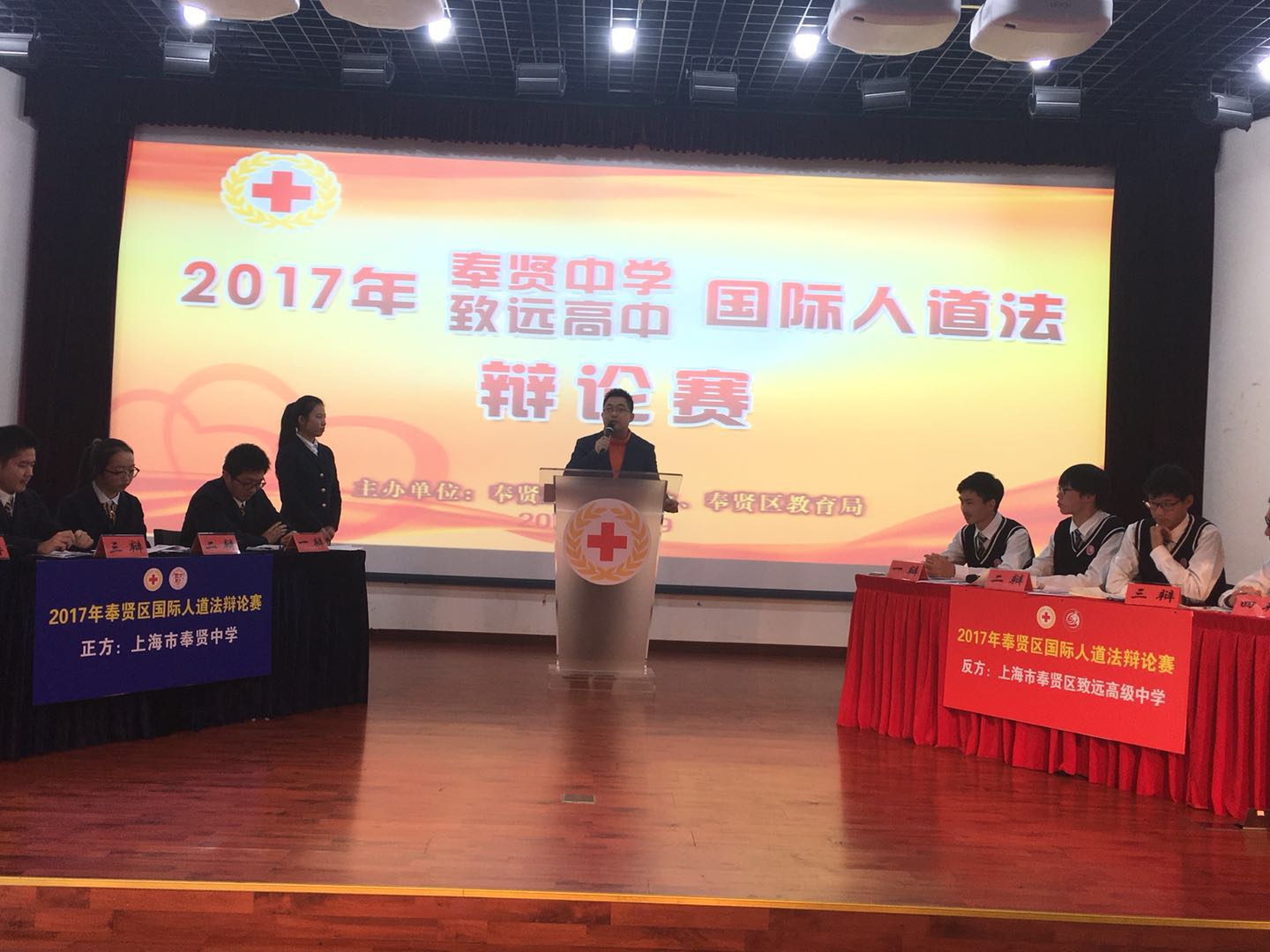 发布时间:2017-12-2012月19日下午,由奉贤区红十字会、区教育局联合主办的2017年中学生国际人道法辩论赛在奉贤中学新疆部多功能厅顺利举行。奉贤区红十字会副调研员张一东、区教育局德育活动科副科长陆斌、奉贤中学副校长胡菊芳、致远高中工会主席郑强以及上海市探索国际人道法项目课程核心师资赵程斌等出席比赛,全区各中学(含中专)、一贯制学校红十字工作分管领导、部分学生代表及家长约90人参加观摩。