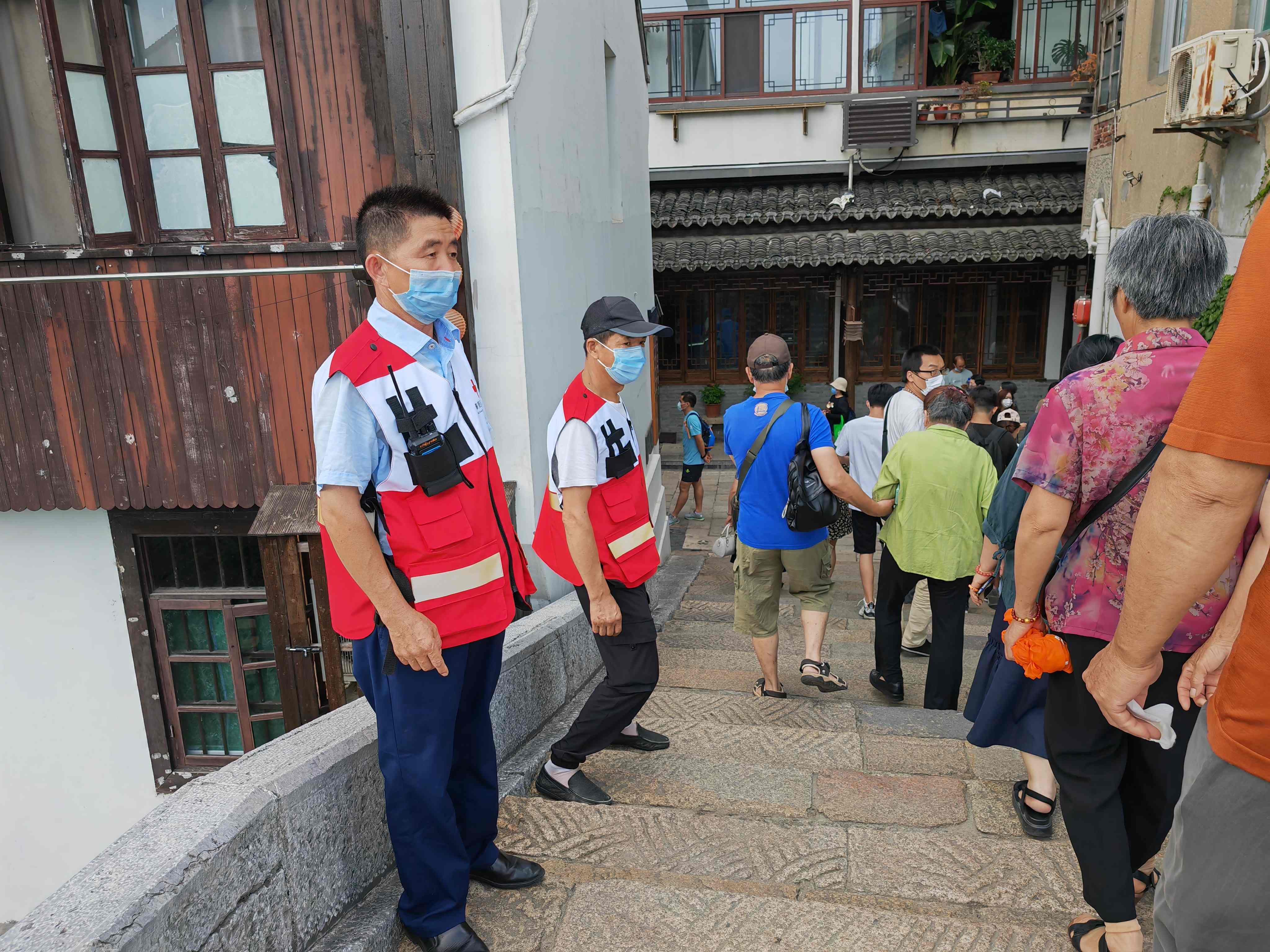 近两年,青溪老街经过修缮和恢复,吸引了全国各地游客前来,人流量剧增也带来了安全隐患。作为网格组长的吴进宝又“不务正业”投入到景区应急救护保障中。2022年春节期间,2名游客不慎落入景观河,正在值守的吴进宝听到呼喊声,第一时间下水施救,用短短15秒将祖孙俩营救上岸。2023年,青村镇红十字会正式成立青溪老街景区应急救护队,吴进宝自告奋勇担任队长,协调4名志愿者开展常态化巡查,同时也为游客们提供健康咨询、紧急救护、测量血压等特色志愿服务。